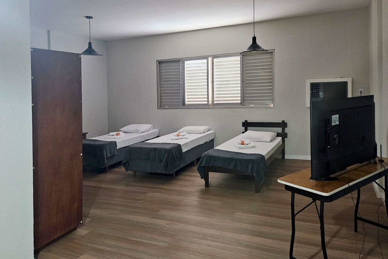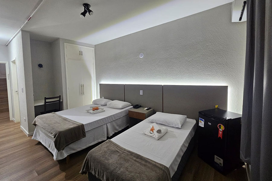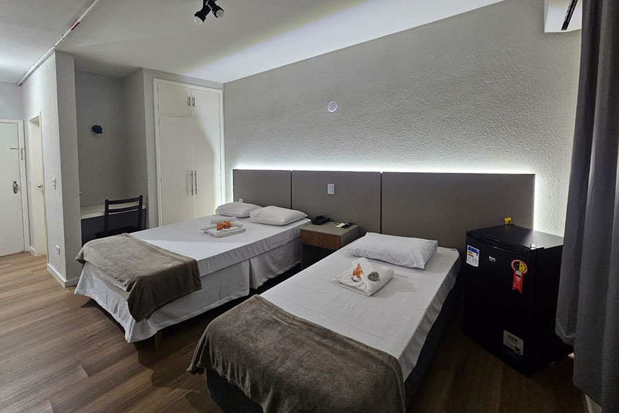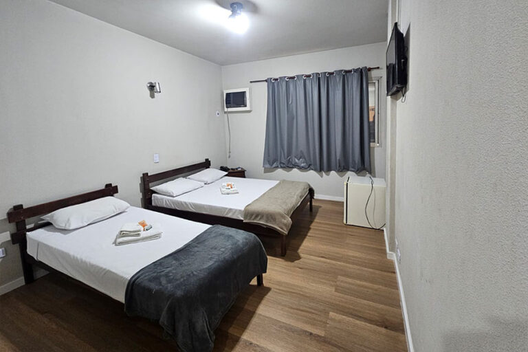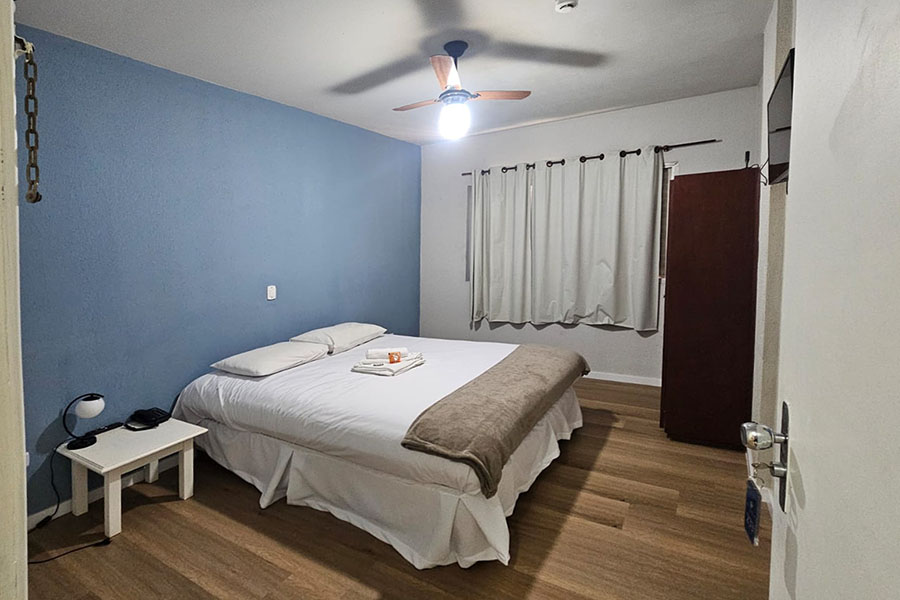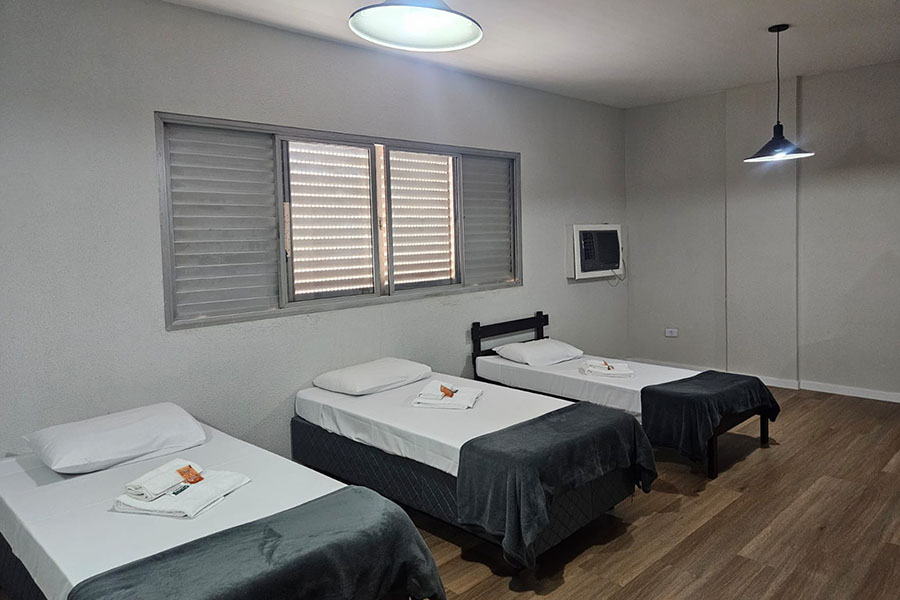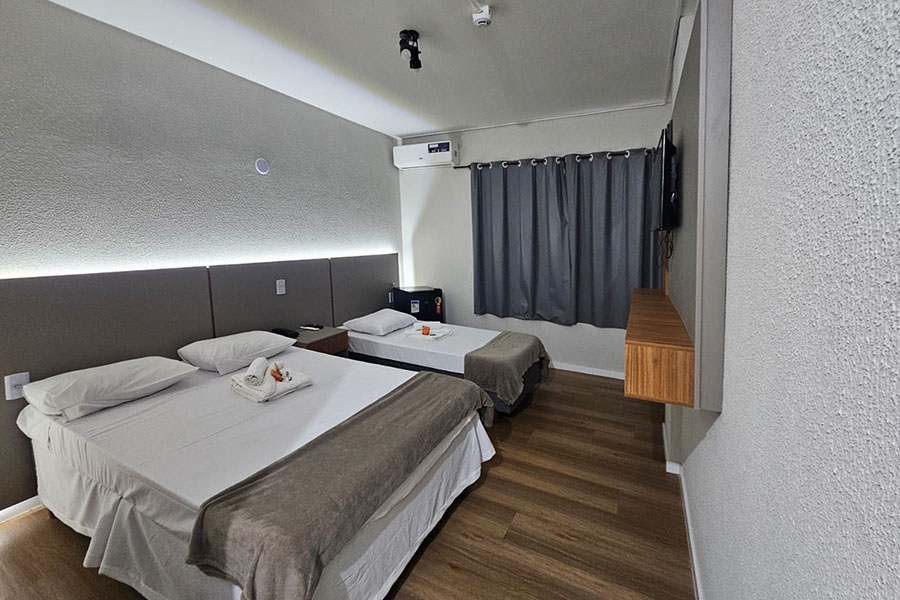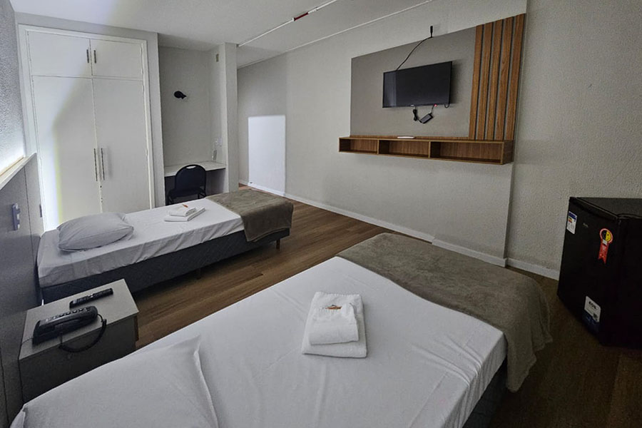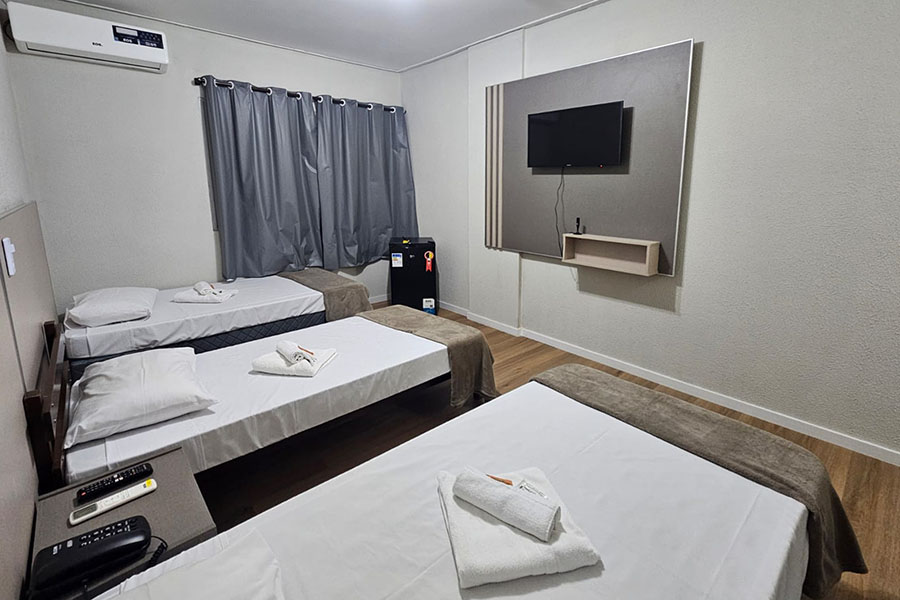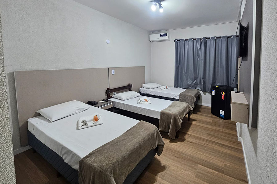 Suíte Família: Ideal para quem viaja com filhos ou amigos. Conta com uma cama de casal, duas de solteiro, TV e ar-condicionado.